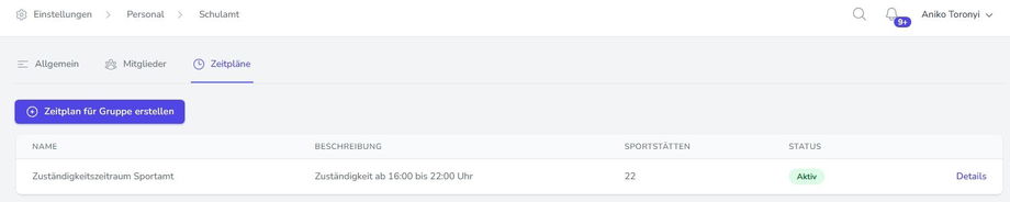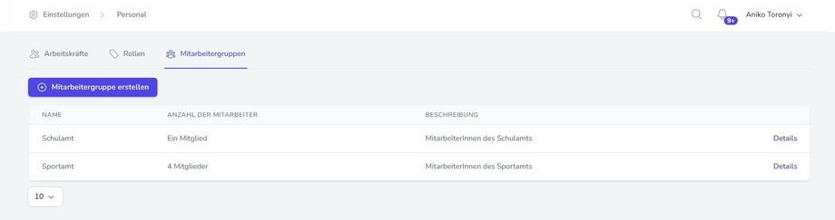Im Reiter „Mitarbeitergruppen“ haben Sie die Möglichkeit, Gruppen anzulegen und zu verwalten. Dies ist insbesondere dann sinnvoll, wenn für bestimmte Mitarbeiter unterschiedliche Zeitpläne (z. B. Zuständigkeitszeiträume) gelten sollen.