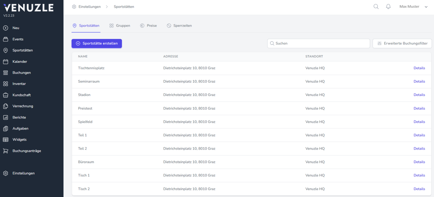 Unter "Einstellungen - Sportstätten" können Sie dem System Ihre einzelnen zu verwaltenden Ressourcen hinzufügen.