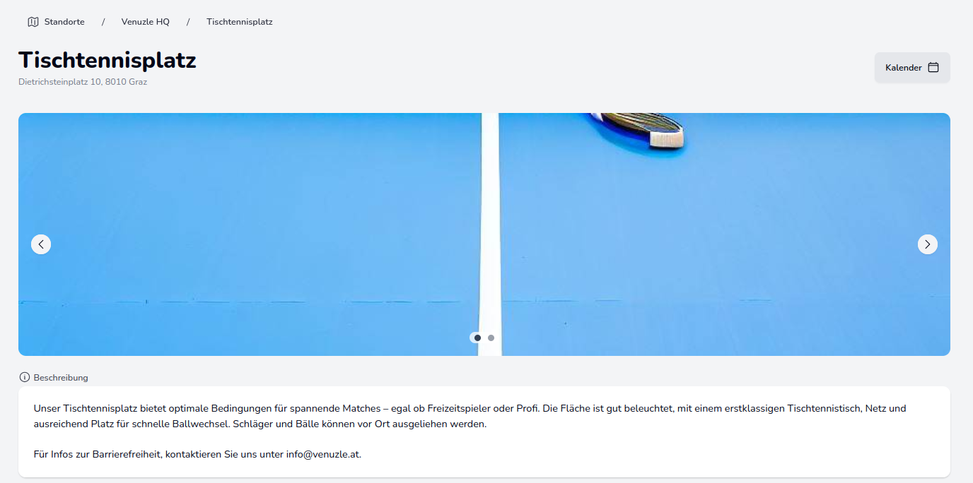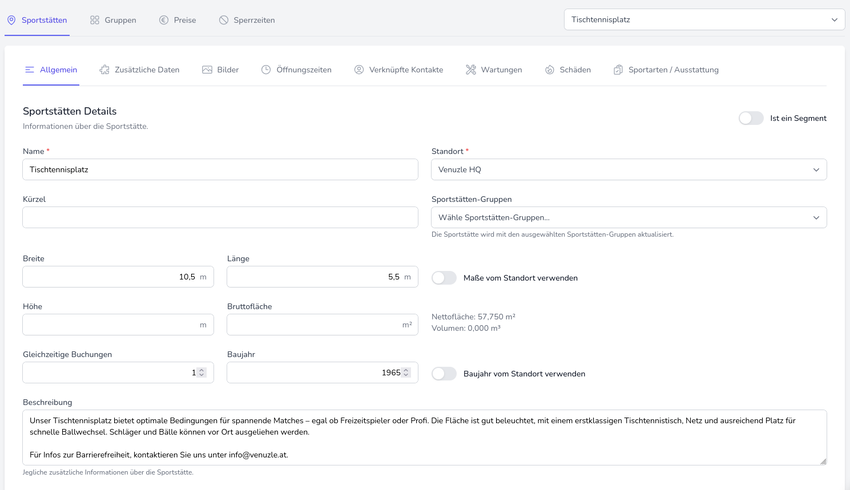 Alle Infos, die im Feld "Beschreibung" hinterlegt werden, sind später auch im Widget auf der Detailseite der Sportstätte sichtbar. Tragen Sie hier also nur Infos ein, die auch für externe Kunden online sichtbar sein sollen.