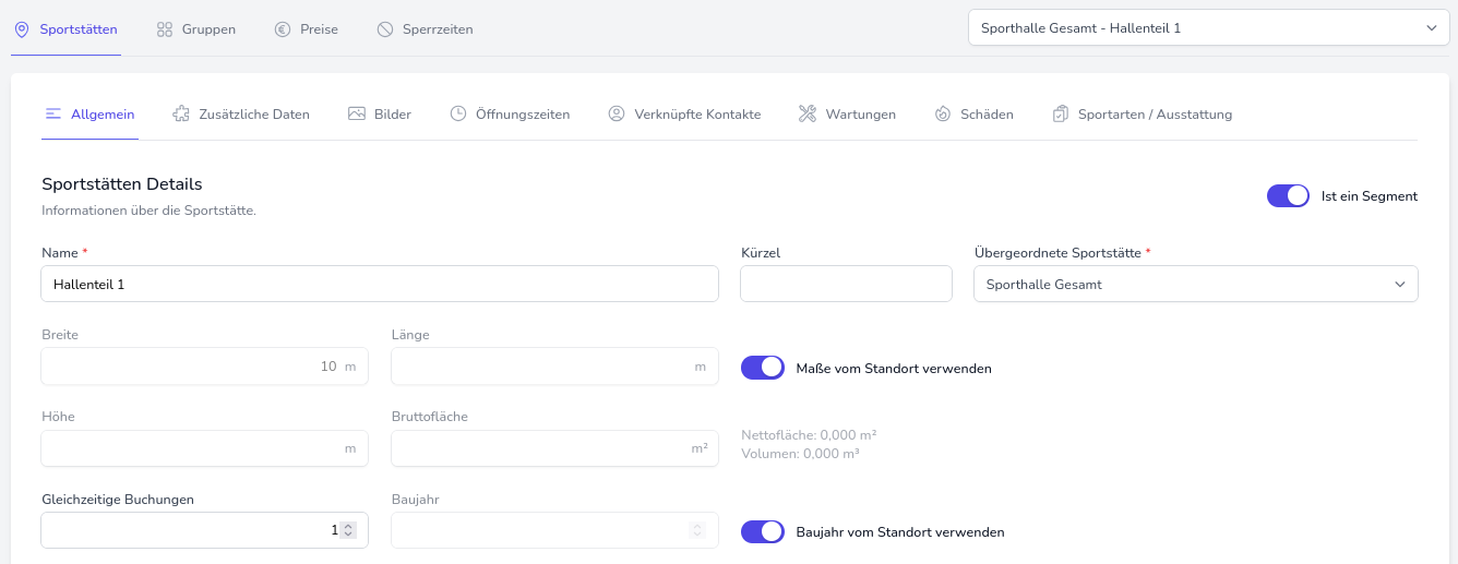 Für teilbare Sportstätten (z.B. Dreifachhallen) müssen die einzelnen Hallenteile als Segment angelegt werden. Hierfür wählt man rechts den Schalter "Ist ein Segment" aus und wählt die übergeordnete Sportstätte aus.
