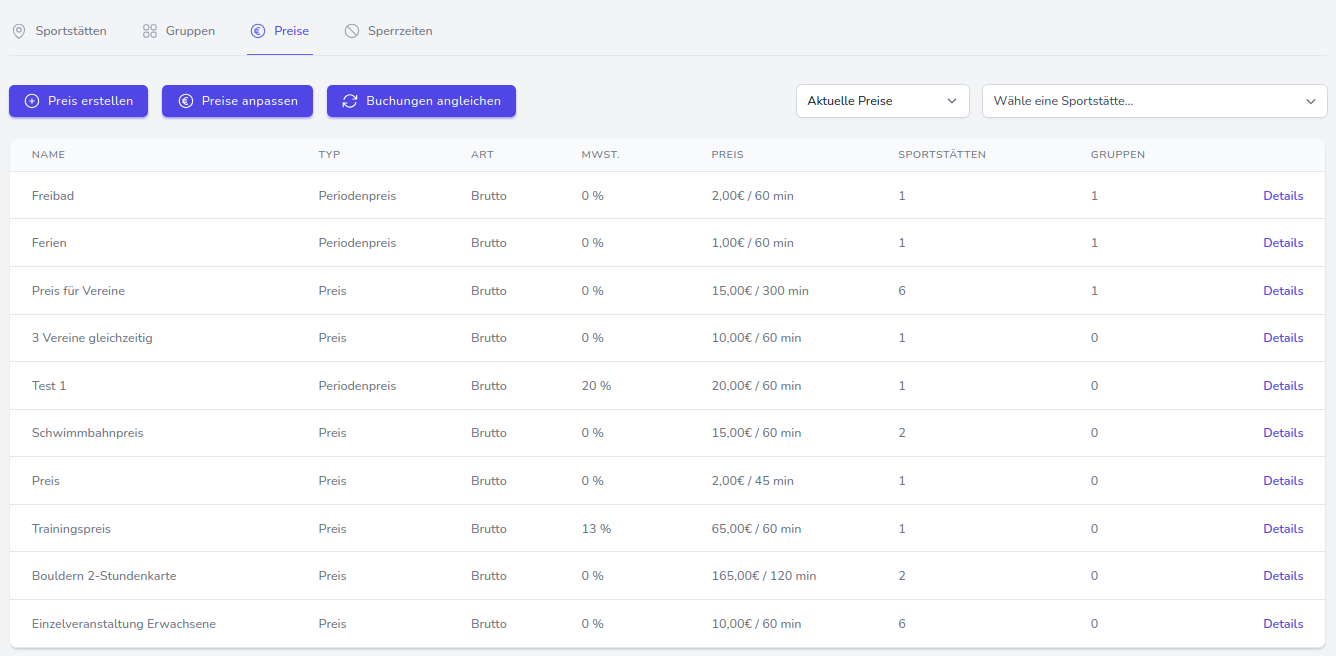 Nach dem Import bzw. dem Anlegen der Sportflächen, ergänzen Sie bitte noch die Preise bzw. Tarife für Ihre Sportstätten.