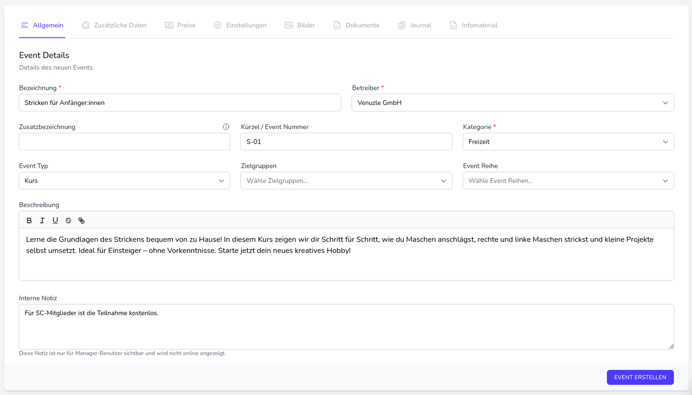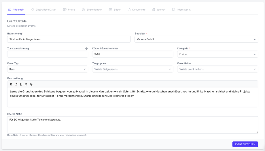 Der Kurs "Stricken für Anfänger" bietet Platz für 15 Teilnehmende. ➜ Im Feld "Max. Teilnehmende" wird die Zahl 15 eingetragen.
