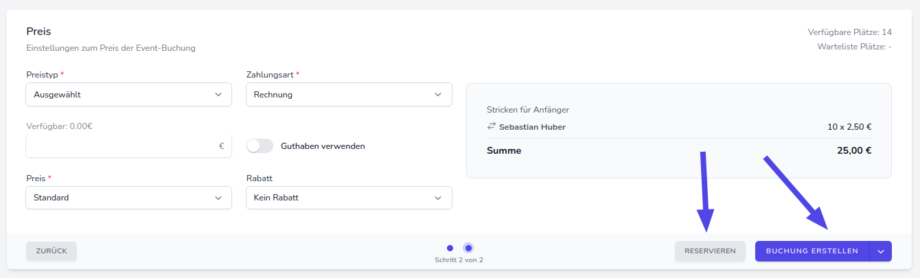 Sie befinden Sich nun in der Preisübersicht, in der Sie die Einstellungen zum Preis überprüfen und gegebenenfalls anpassen können, bevor Sie die Buchung abschließen. Standardmäßig wird der Preis gewählt, der im Event hinterlegt ist. Sind mehrere Preise hinterlegt, können Sie im Feld "Preis" den passenden Preis auswählen.