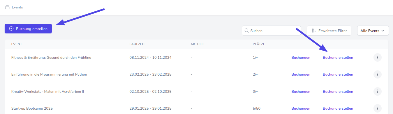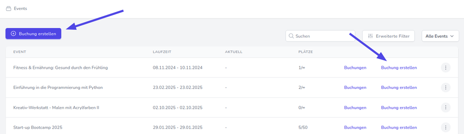 Option 3: Navigieren Sie zur Event-Übersicht und klicken Sie anschließend auf "Buchung erstellen". Alternativ können Sie auch direkt neben dem gewählten Event auf "Buchung erstellen" klicken. So startet der Buchungsprozess gleich für das gewählte Event.