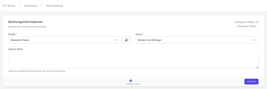 Wählen Sie hier die Person (und ggf. die Teilnehmer:innen) aus, für die Sie die Buchung tätigen möchten. Wählen Sie außerdem das zu buchende Event aus (sofern es nicht bereits vorausgewählt wurde). Optional kann noch eine interne Notiz hinterlegt werden, die weiterführende Infos zur Buchung enthalten kann. Diese dient nur internen Zwecken.