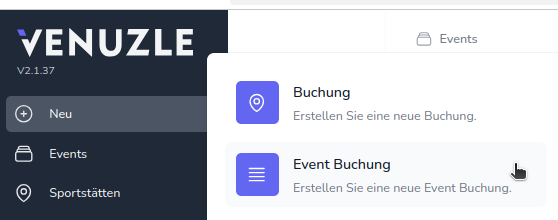 Sobald im Venuzle Manager die ersten Events angelegt wurden, kann man mit dem Buchen loslegen. Dabei gibt es unterschiedliche Möglichkeiten Events zu buchen bzw. einen Buchungsprozess zu starten.
