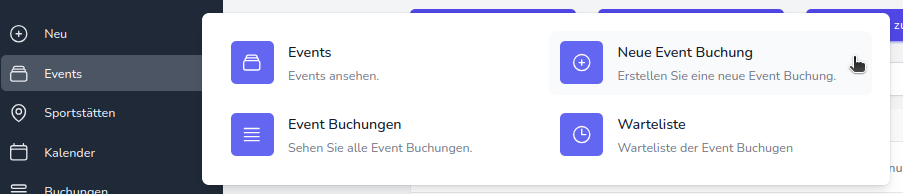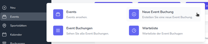 Option 2: Klicken Sie im Menü auf "Events" und anschließend auf "Neue Event Buchung".