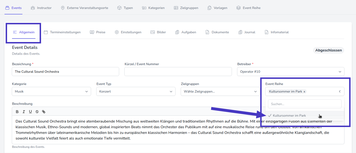 Navigieren Sie in die Einstellungen des Events, das Sie der Reihe hinzufügen möchten. Im Reiter Allgemein können Sie im Feld Event Reihe die gewünschte Reihe auswählen. Hier ist auch eine Mehrfachauswahl möglich. Klicken Sie abschließend auf Speichern, damit die Änderungen übernommen werden.