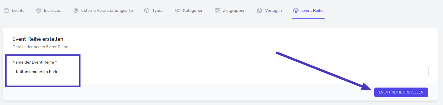 Tragen Sie nun den Namen der Event-Reihe ein und klicken Sie anschließend auf Event Reihe erstellen um fortzufahren.