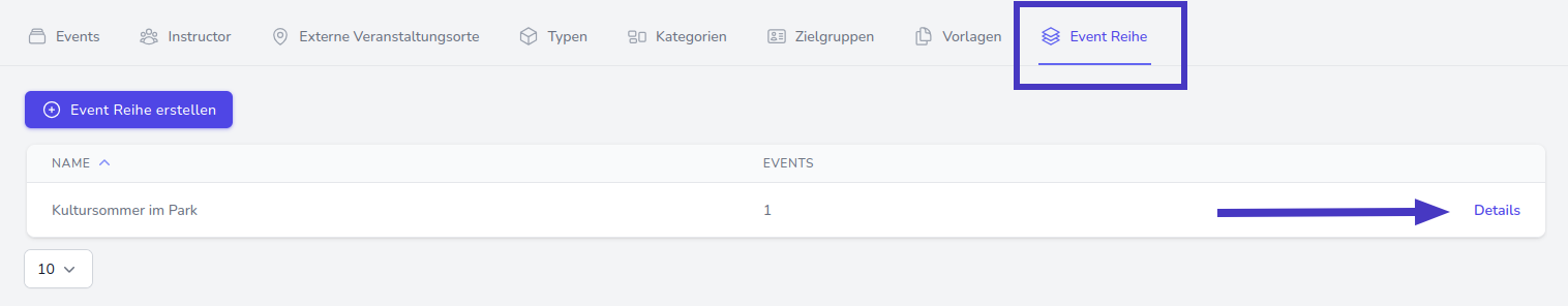 Das Event ist nun der Reihe zugeordnet. Sie können dies überprüfen, indem Sie in den Reiter Event Reihe navigieren und dort die entsprechende Reihe mit Klick auf Details auswählen.