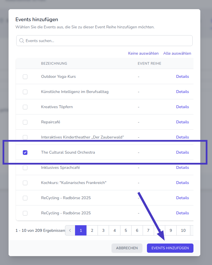 Nun öffnet sich ein neues Fenster, in welchem alle verfügbaren Events aufgelistet werden. Hier wählen Sie alle Events aus, die Sie der Reihe hinzufügen möchten, indem Sie das Häkchen beim entsprechenden Event setzen.