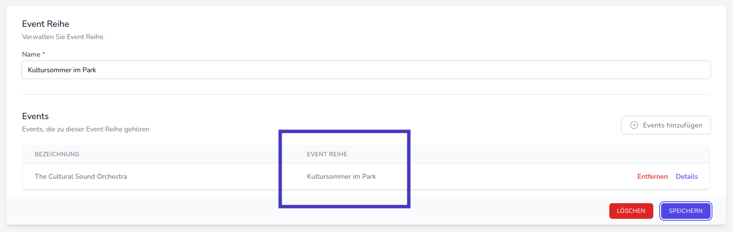 Ausgewählte Events werden nun in der Übersicht aufgelistet. Erst nachdem Sie auf Speichern geklickt haben, ist die Zuordnung abgeschlossen. Der Name der Event-Reihe sollte nun in der entsprechenden Spalte erscheinen.