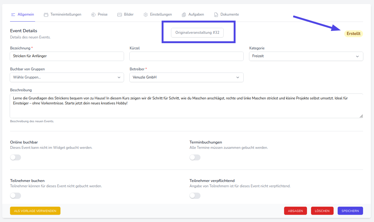Das kopierte Event erhält den Status "Erstellt" und kann nun nachträglich noch bearbeitet werden. Event-Kopien sind immer daran erkennbar, dass in den Einstellungen des Events (Reiter "Allgemein") die Nummer des Original Events angezeigt wird. Sie können dieses einfach über Klick auf die Event-Nummer anzeigen.