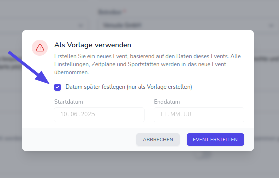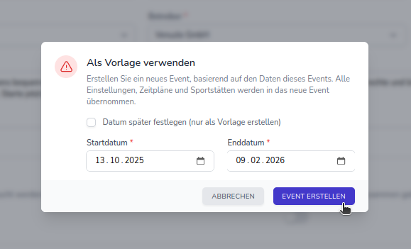 Um die Erstellung von Events zu vereinfachen, ist es möglich Event-Vorlagen zu erstellen. Auf diese Weise können wiederkehrende bzw. Events mit ähnlichen Einstellungen, Zeitplänen und Sportstätten einfach kopiert werden und müssen nicht wieder komplett neu angelegt werden.