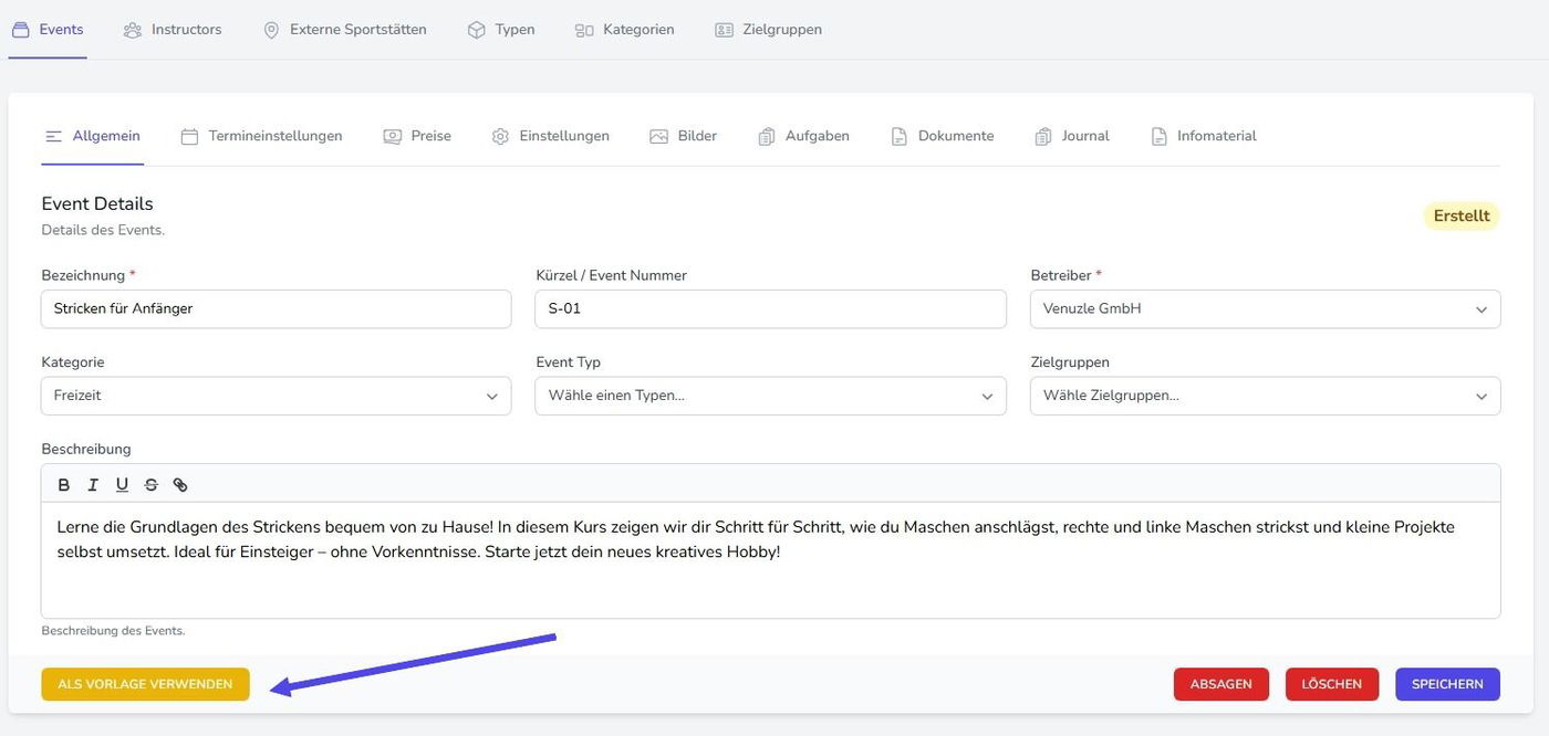 Eine gänzlich neue Vorlage zu erstellen, ist dann ratsam, wenn Sie verschiedene Arten von Events im System hinterlegen möchten, die immer wieder verwendet werden.