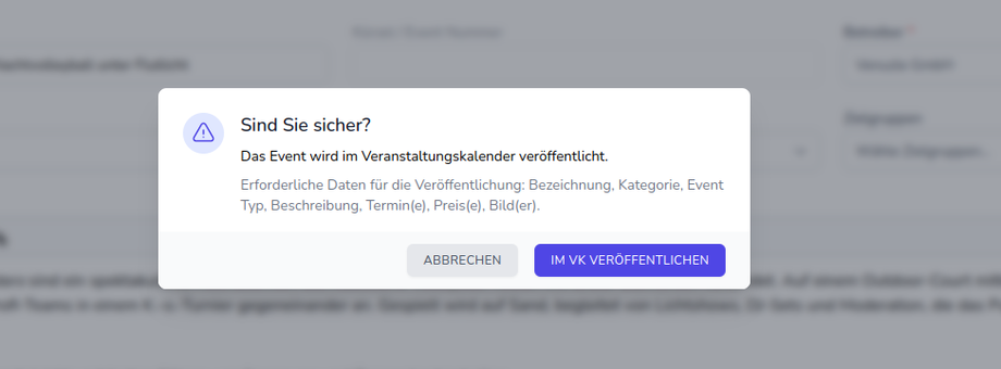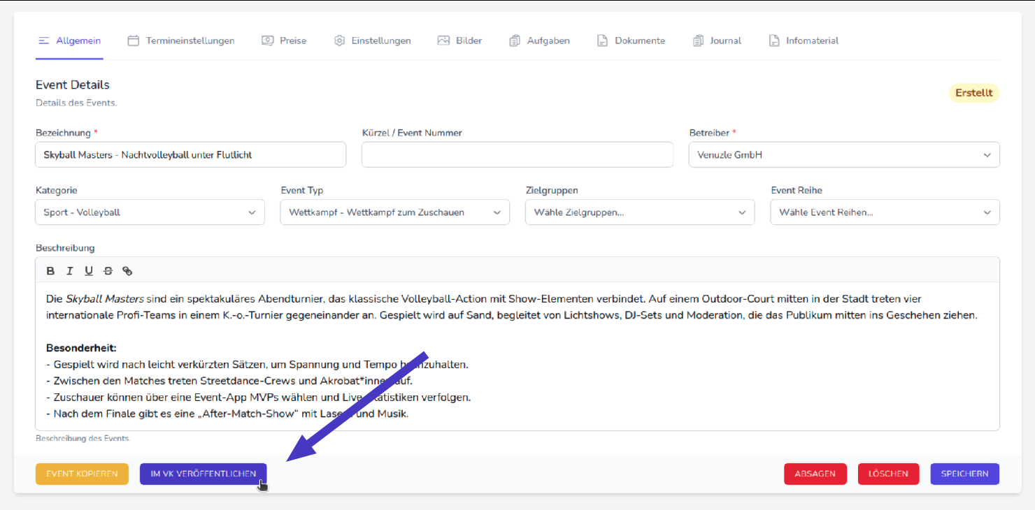 Sobald alle notwendigen Daten ergänzt wurden, kann die Veranstaltung (unabhängig vom Status) veröffentlicht werden.