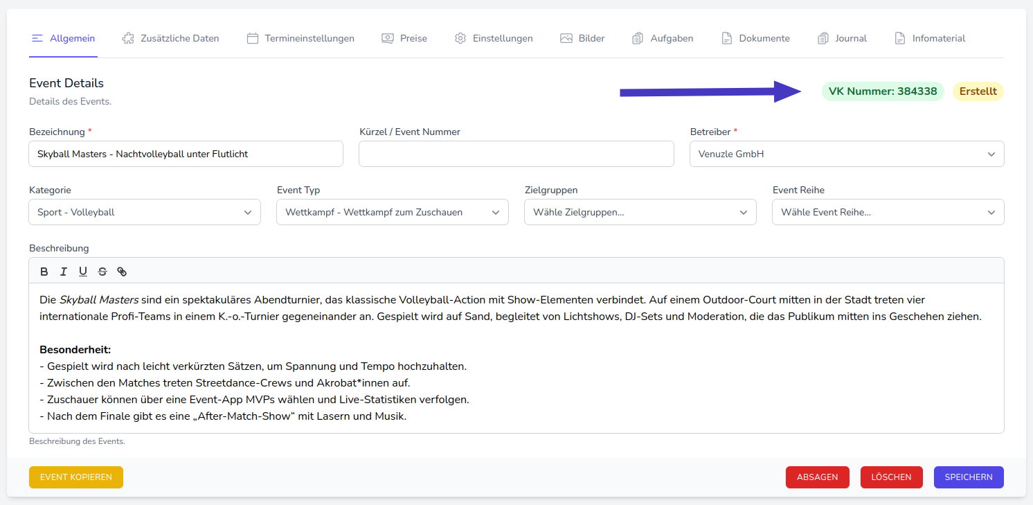 Nach erfolgreicher Veröffentlichung erscheint die Meldung "Das Event wurde erfolgreich veröffentlicht". Die einzigartige Eventnummer wird aus dem Veranstaltungskalender importiert und dem Event zugewiesen. Nach dieser Nummer kann über die allgemeinen Suche des Managers gesucht werden.