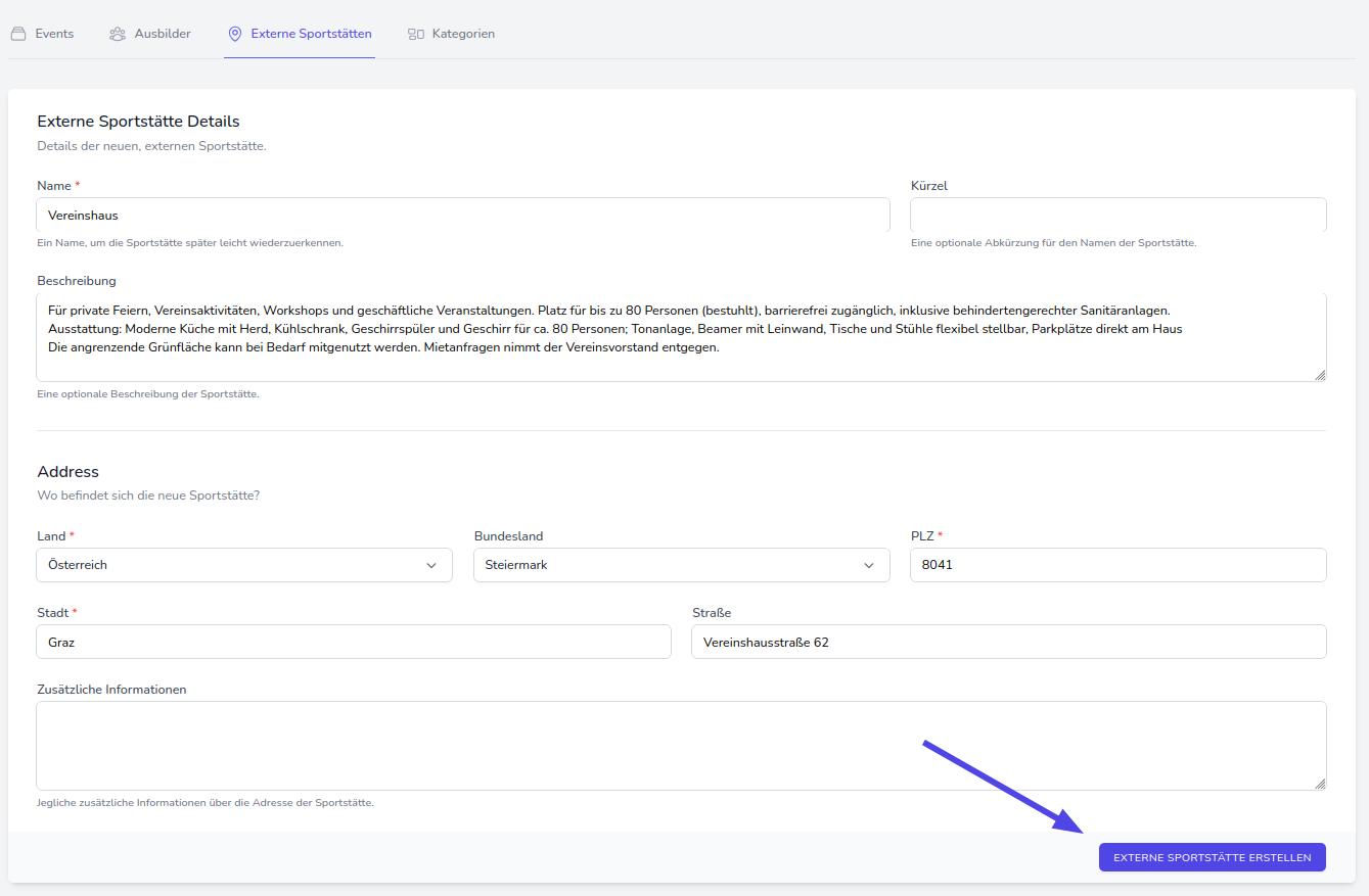 Klicken Sie auf "Externe Sportstätte erstellen" um die Sportstätte anzulegen. Diese kann ab sofort Events zugeordnet werden.