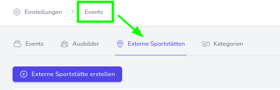 Um eine neue externe Sportsttätte anzulegen, navigieren Sie über die Event-Einstellungen zum Reiter Externe Sportstätten.