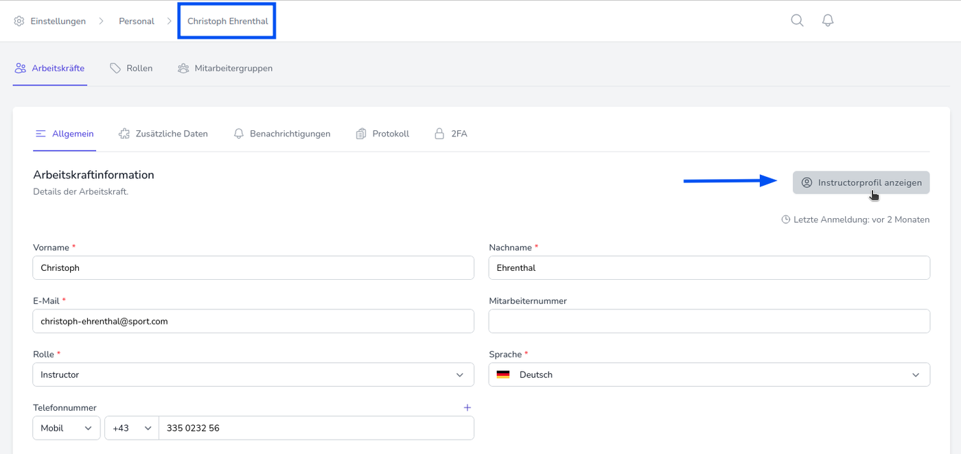 Nun wird eine neue Arbeitskraft erstellt und Sie werden automatisch zum neuen Personal-Profil des Instructors weitergeleitet. Hier können Sie alle Angaben nochmals überprüfen und gegebenenfalls anpassen.