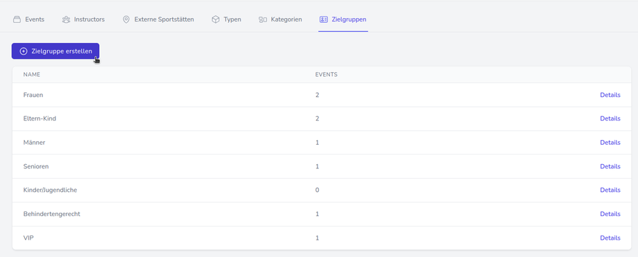 Im Venuzle Manager können für Events bei Bedarf beliebig viele Zielgruppen hinterlegt werden. Diese dienen im Widget neben Informationen über das jeweilige Zielpublikum auch zum Filtern von Events.