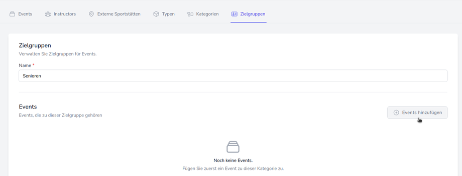 - Ordnen Sie die Zielgruppe einem Event hinzu indem Sie in der Zielgruppe auf "Event hinzufügen" klicken. Alternativ können Sie die Zielgruppe direkt in den allgemeinen Event-Einstellungen hinzufügen.