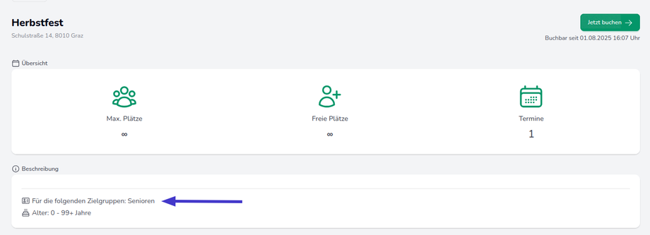 - Testen Sie anschließend ob die Zielgruppe online in der Beschreibung des Events angezeigt wird.