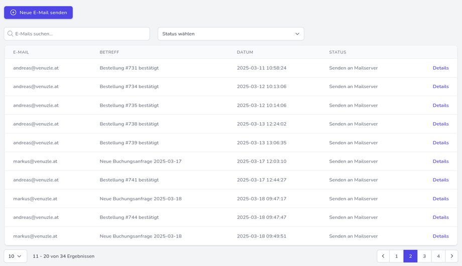 Es öffnet sich eine Liste aller versendeten E-Mails, nach Datum sortiert. Man kann über die Suchleiste direkt nach E-Mails suchen oder diese über das Drop-Down-Feld nach Status filtern. Außerdem kann über den blauen Button auch eine neue E-Mail versendet werden.
