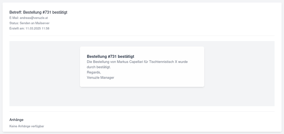 Alle E-Mail Nachrichten, die über den Venuzle Manager versendet wurden, können direkt über das Menü mit einem Klick auf das Brief-Symbol unten links abgerufen werden.