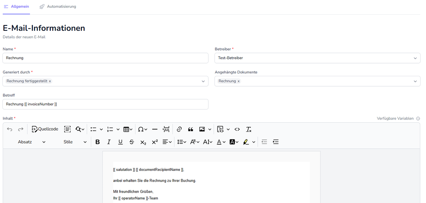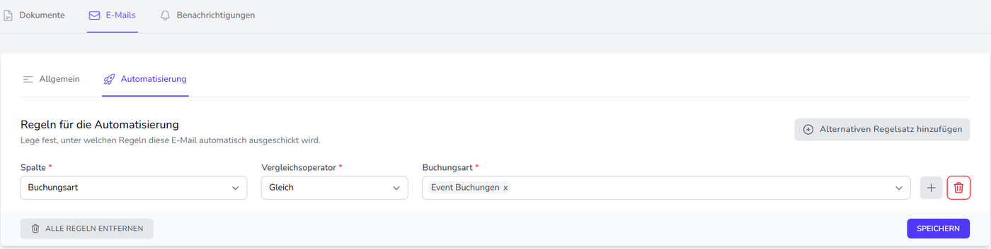 Im Reiter “Automatisierung” werden Regeln hinterlegt, damit ein automatisierter E-Mailversand erfolgt. Ist keine Regel hinterlegt, werden keine E-Mails automatisch versandt.