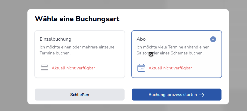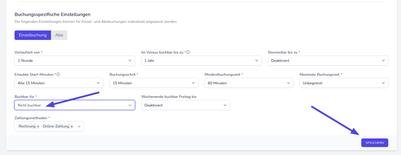 Scrollen Sie zum Bereich Buchungsspezifische Einstellungen, wählen Sie im Feld “Buchbar für” die Option “Nicht buchbar” aus und klicken Sie anschließend auf Speichern. Führen Sie den Schritt für beide Buchungsarten, Einzelbuchung und Abo, aus.