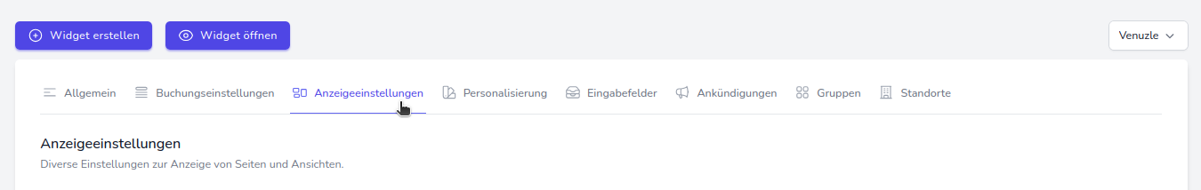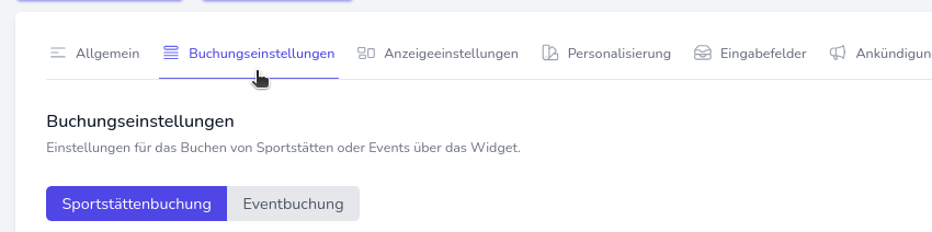 Navigieren Sie nun in die Buchungseinstellungen des Widgets und stellen Sie sicher, dass Sie sich in den Einstellungen für Sportstättenbuchungen befinden.