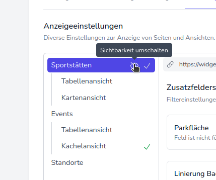 Falls im Widget nur Events und keine Sportstätten angezeigt werden sollen, stellen Sie nun die Sichtbarkeit der Sportstätten um, indem Sie auf das kleine Augensymbol klicken.