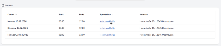 Über den Sportstättenkalender sollten außerdem keine Buchungen möglich sein. Dieser kann in der Liste der Event-Termine über den Sportstättenlink aufgerufen werden.
