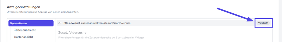 Überprüfen Sie anschließend, ob die Sichtbarkeit umgestellt wurde. Die Begriffe “Sportstätte”, “Kartenansicht” und “Tabellenansicht” müssen durchgestrichen sein und der Status “Versteckt”.