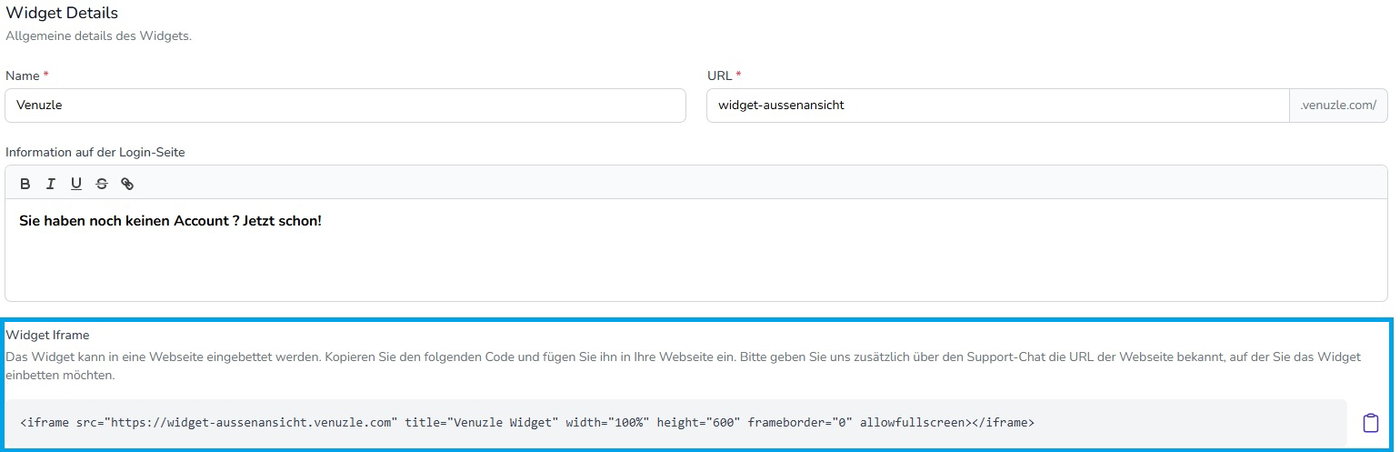 Bitte geben Sie uns zusätzlich über den Support-Chat die URL der Website bekannt, auf der Sie das Widget einbetten möchten.