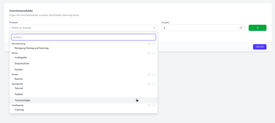 Im Buchungsprozess wird die Auswahl des Inventars anschließend erleichtert, da die verfügbaren Elemente im Dropdown-Menü übersichtlich nach Kategorien geordnet angezeigt werden.