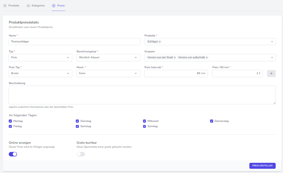 In der Preiserstellung selbst können Sie festlegen, welche Art von Preistyp Ihr Produkt besitzen soll,wieviel das jeweilige Produkt kostet und vieles mehr. Zusätzlich können Sie dem Preis eine Beschreibung verleihen und Verfügbarkeiten einrichten.