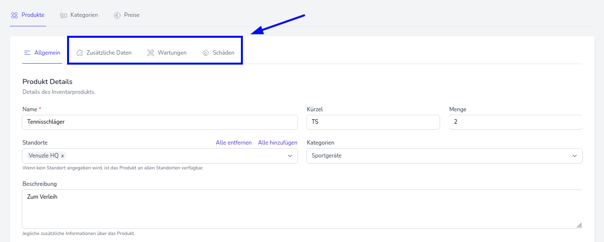 Sobald man auf "Produkt erstellen" klickt, erscheinen 3 weitere Reiter. "Zusätzliche Daten", "Wartungen", "Schäden". Wenn Sie dem Produkt weitere Informationen hinzufügen wollen, können Sie diese zusätzlichen Kategorien ausfüllen.
