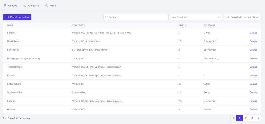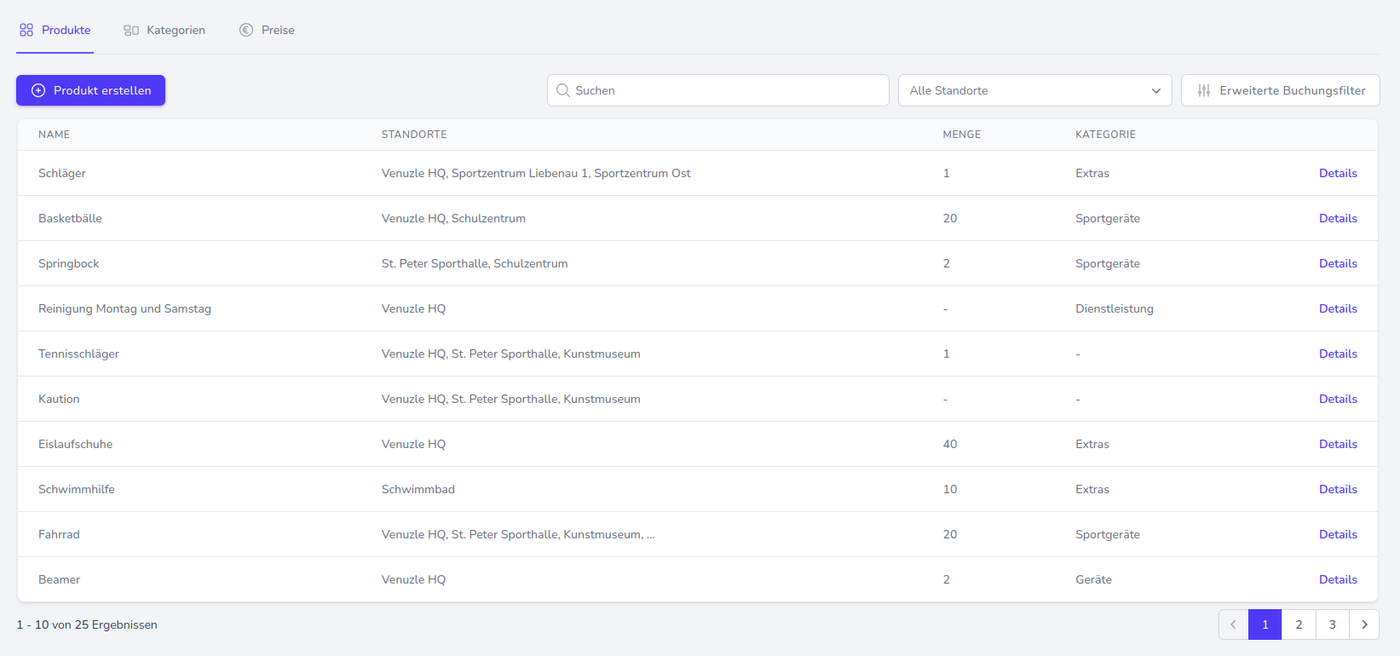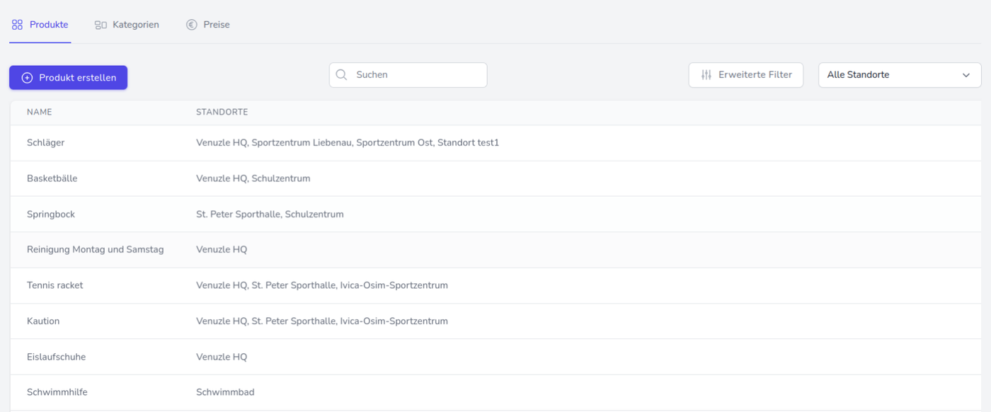 Der Venuzle Manager bietet die Möglichkeit Produkte verschiedenster Arten zu verwalten und zu buchen.