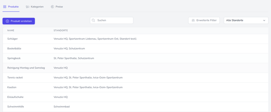 Diese Funktion wird vor allem zum Verwalten von Inventargegenständen genutzt, eignet sich aber auch für alle Arten von Produkten, die einer Sportstätte zugeordnet werden und zusätzlich gebucht werden können (z.B. Zusatzleistungen, Ausrüstung etc.).