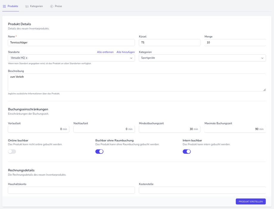 Klickt man auf Produkte erstellen, öffnet sich eine Eingabemaske, in der die Details zum neuen Produkt hinterlegt werden. Sie können dem Produkt zum Beispiel eine Beschreibung hinzufügen und den Standort auswählen, an dem das Produkt verfügbar ist.