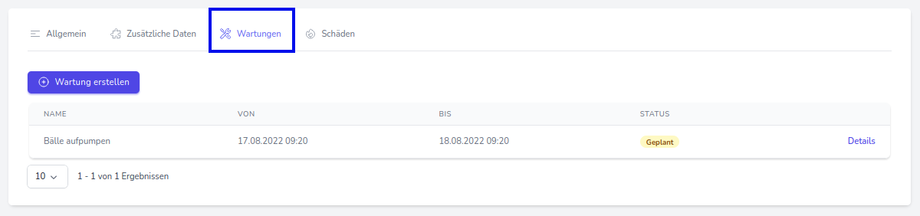 Im Reiter Wartungen können neue Wartungsarbeiten am jeweiligen Produkt eingetragen und verwaltet werden.
