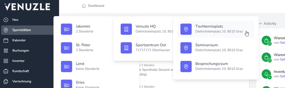 Um zum Einzelkalender einer Sportstätte zu gelangen, navigiert man über das Sportstätten-Menü bis zur gewünschten Sportstätte und klickt diese an.