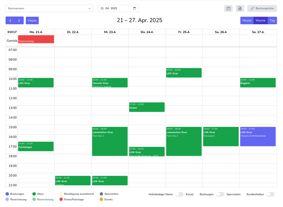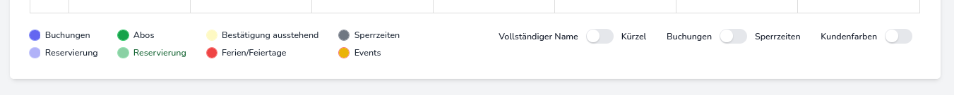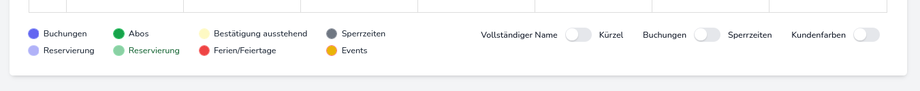 Unter dem Kalender findet man die Legende zur Erklärung der verschiedenen Farbgebungen der Buchungen.