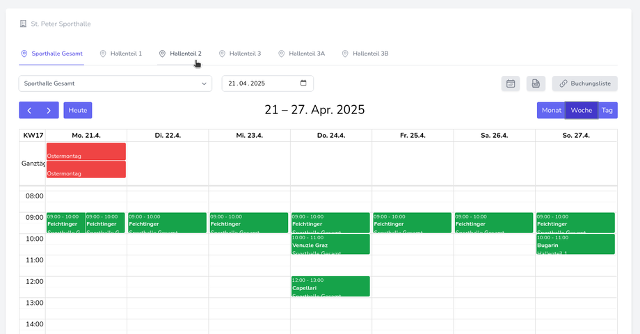 Kalender von Sportstätten, die in ein oder mehrere Segmente aufgeteilt sind, zeigen in der ersten Ansicht immer die Buchungen der gesamten Sportstätte an. Sie verfügen über einen weiteren Reiter pro Segment. Man kann zwischen den Segmenten wechseln, indem man auf den entsprechenden Reiter klickt.