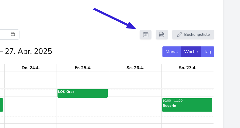 Über die grauen Symbole im rechten oberen Bildschirmrand hat man unterschiedliche Möglichkeiten, die Kalenderdaten zu exportieren. Exporte sind für alle 3 Ansichtsarten (Monat, Woche, Tag) möglich.