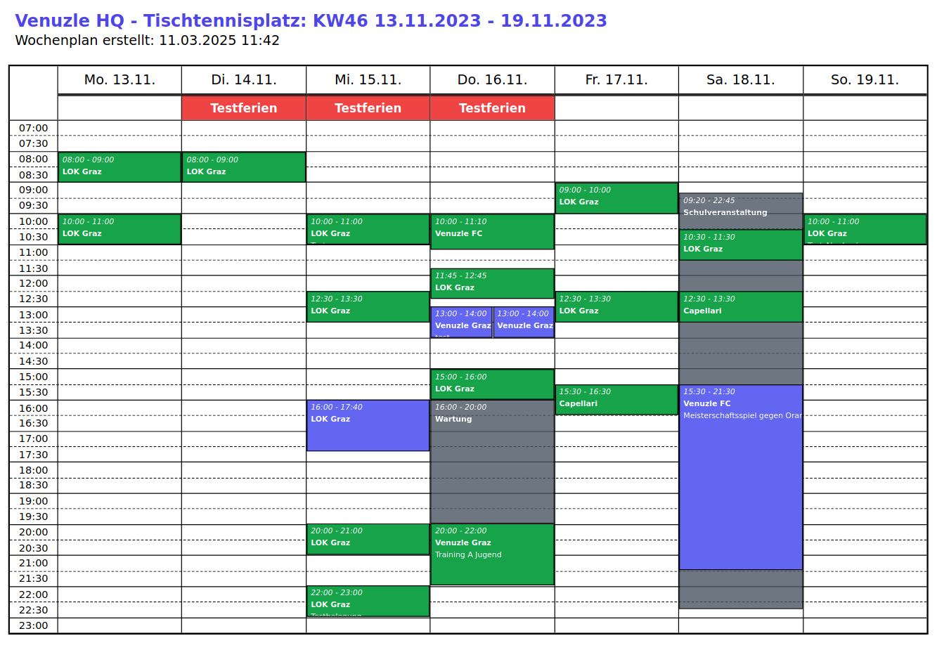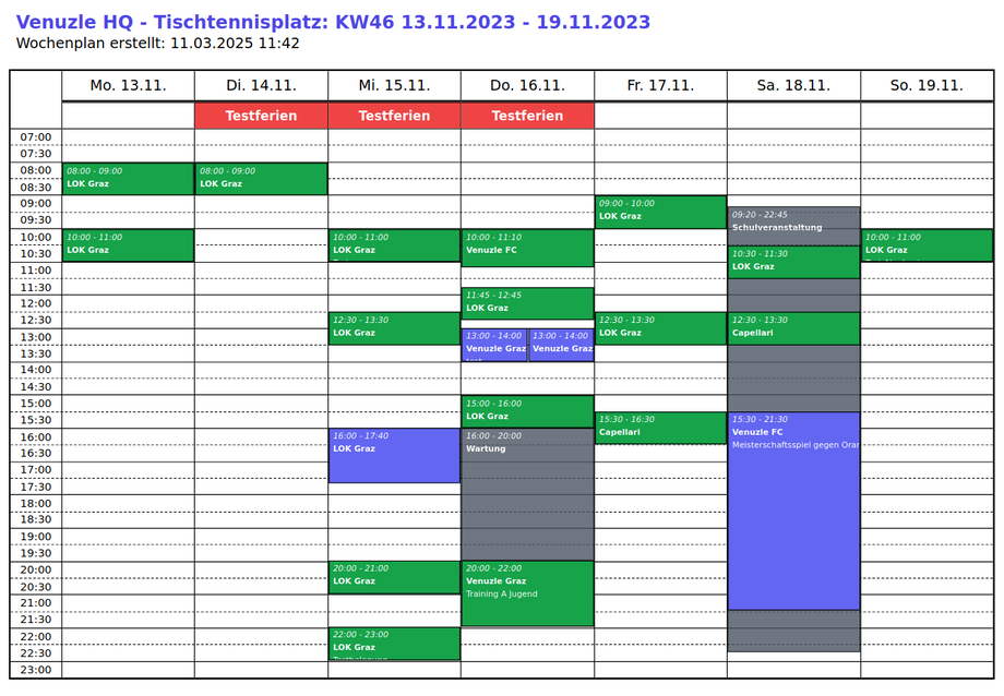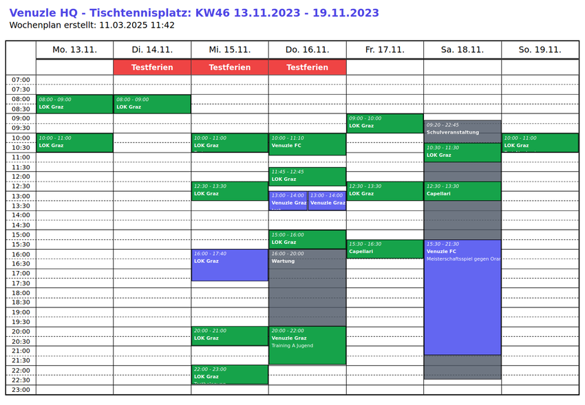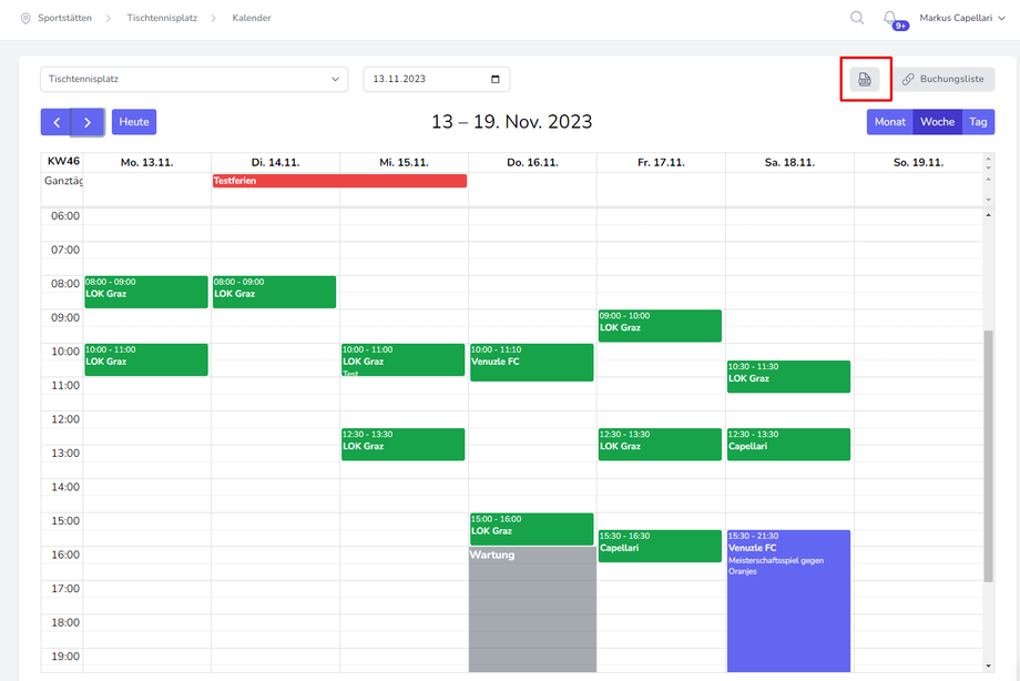 Um einen Überblick über die Belegung einzelner Sportstätten zu bekommen, können im Venuzle Manager Belegungspläne als PDF exportiert werden.