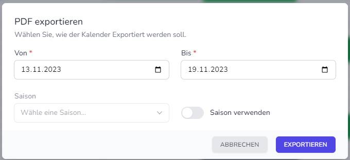 Anschließend öffnet sich eine Maske, in der Sie den gewünschten Zeitraum oder eine bestimmte Saison für den Export auswählen können.
