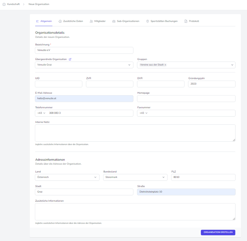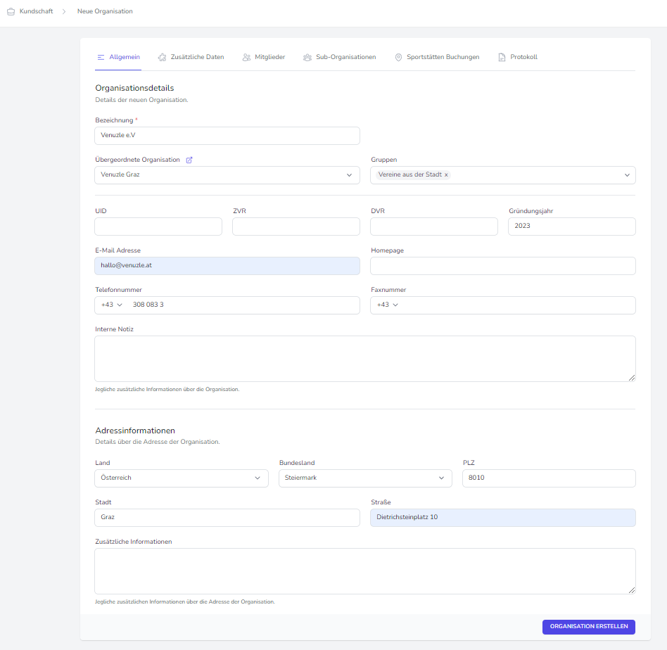 Bei den Organisationen ist in diesem Feld zumindest der Name der Organisation einzutragen, alle anderen Felder sind optional. Zum Abschließen klicken Sie auf "Organisation erstellen".